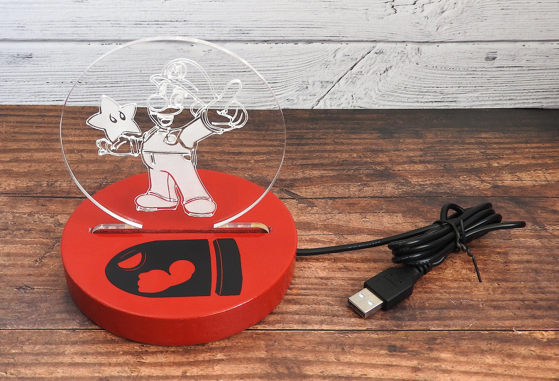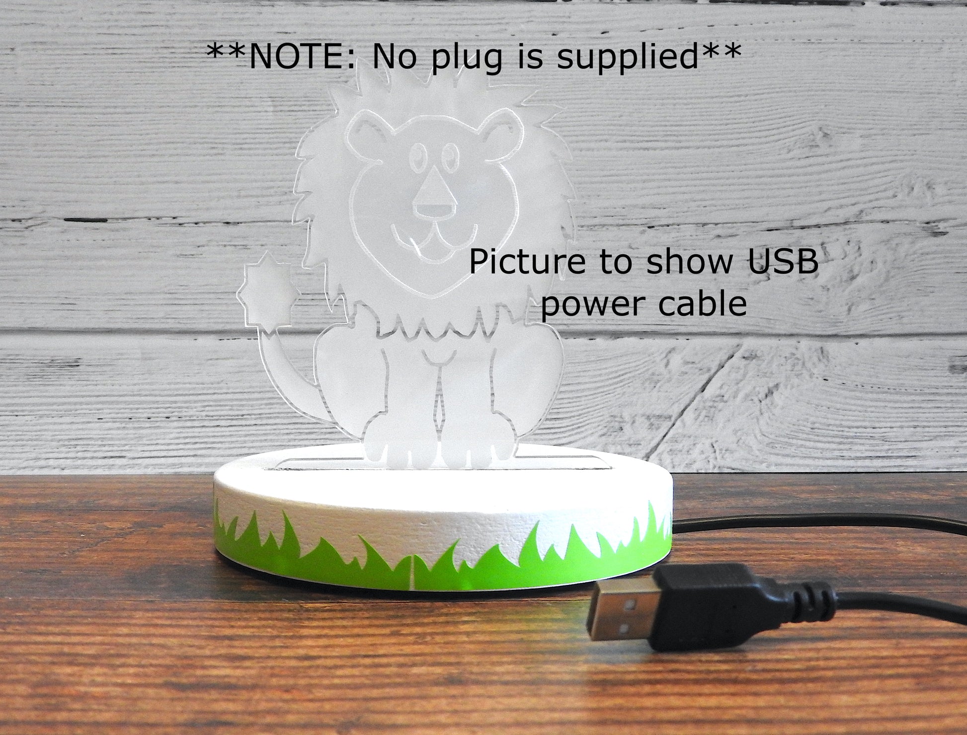 The acrylic is 5mm thick cast acrylic. It powers up from a 5v USB cable approximately 1m long. Please note it is NOT supplied with a plug.